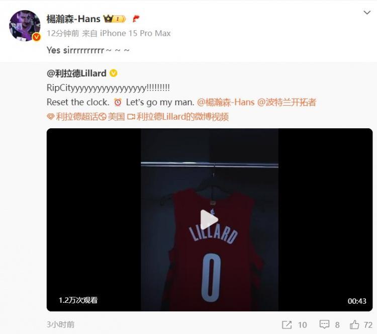 杨瀚森转发了利拉德的这条动态,并在旁边写道:“Yes sirrrrrrrrrr~~~”